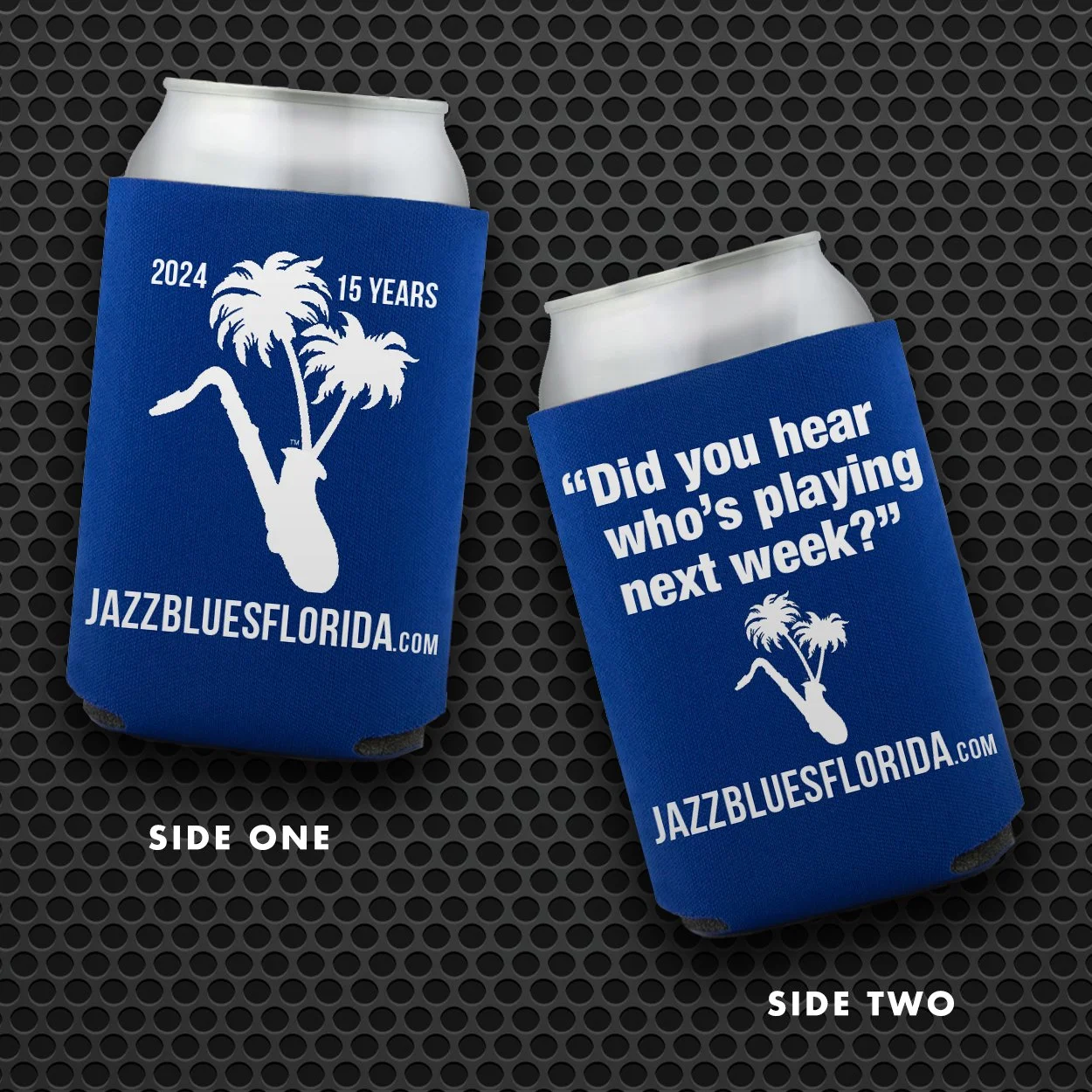 Here in Florida, we know hot! Hot jazz, hot blues, hot days and hot nights. Keep your cool with this set of two commemorative can coolers. Each cooler printed front and back as shown.